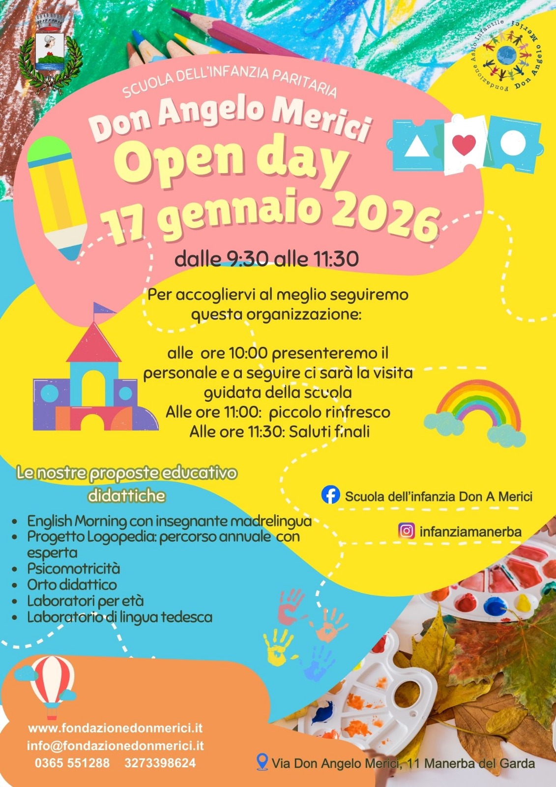 Open day scuola dell'infanzia paritaria Don Angelo Merici  il giorno 17 gennaio 2026 dalle ore 9:30 alle ore 11:30.